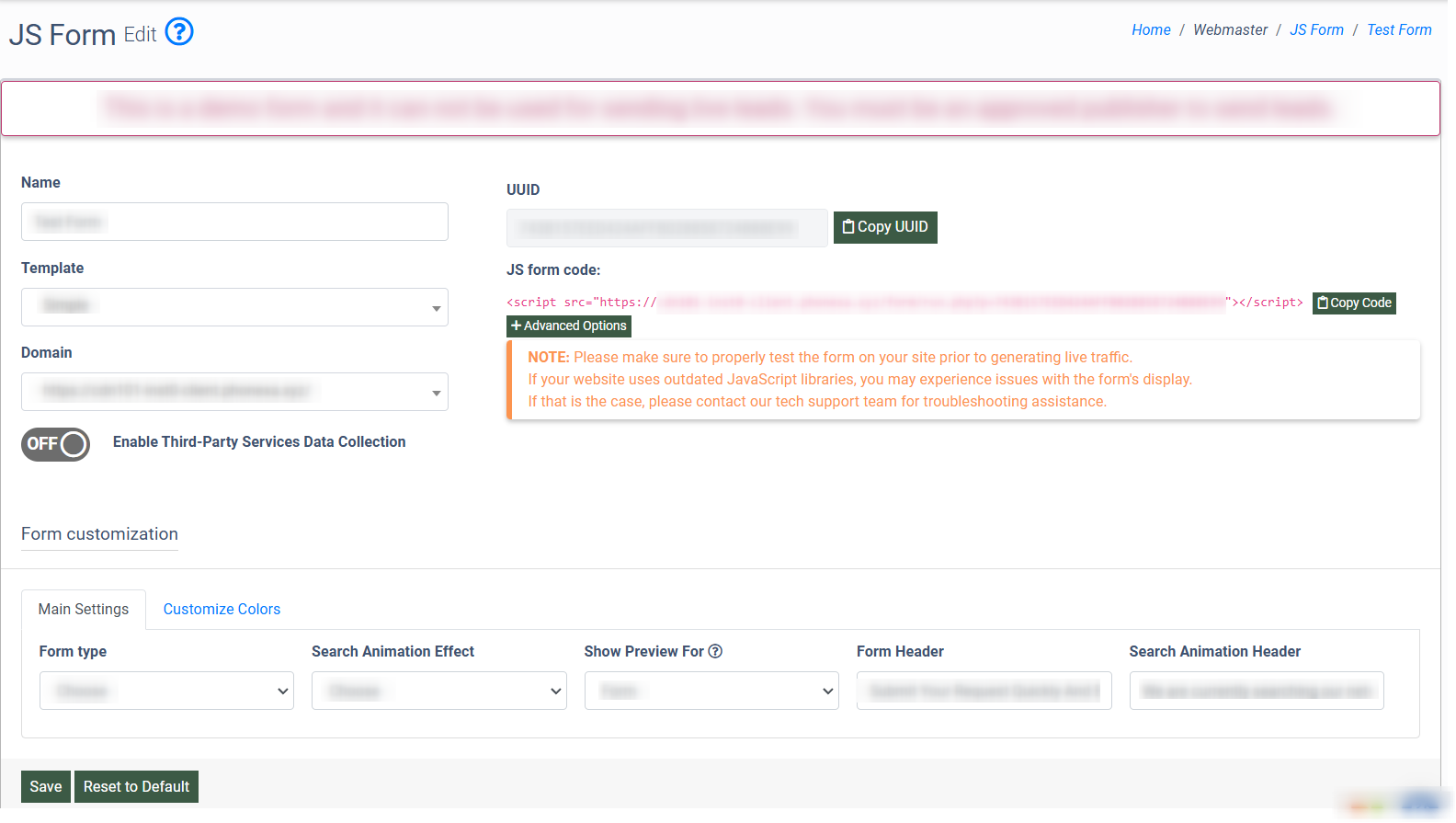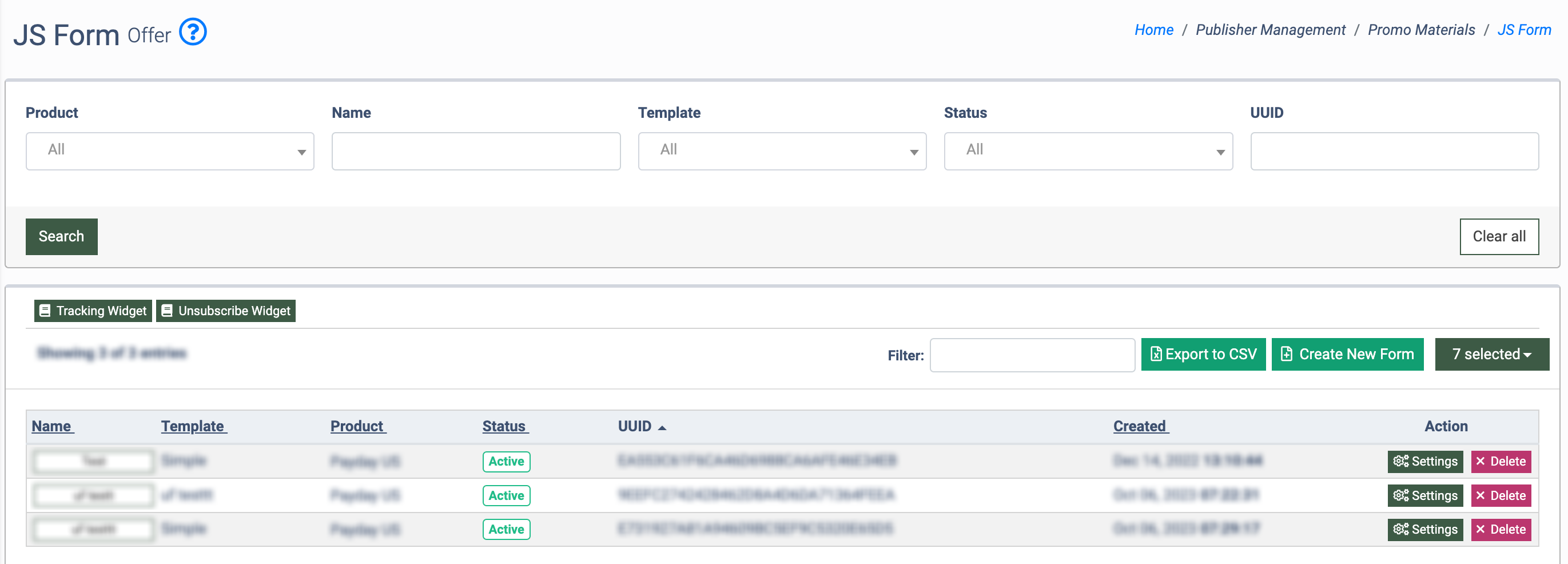 To access, go to the Publisher Management > Promo Materials > JS Form section.