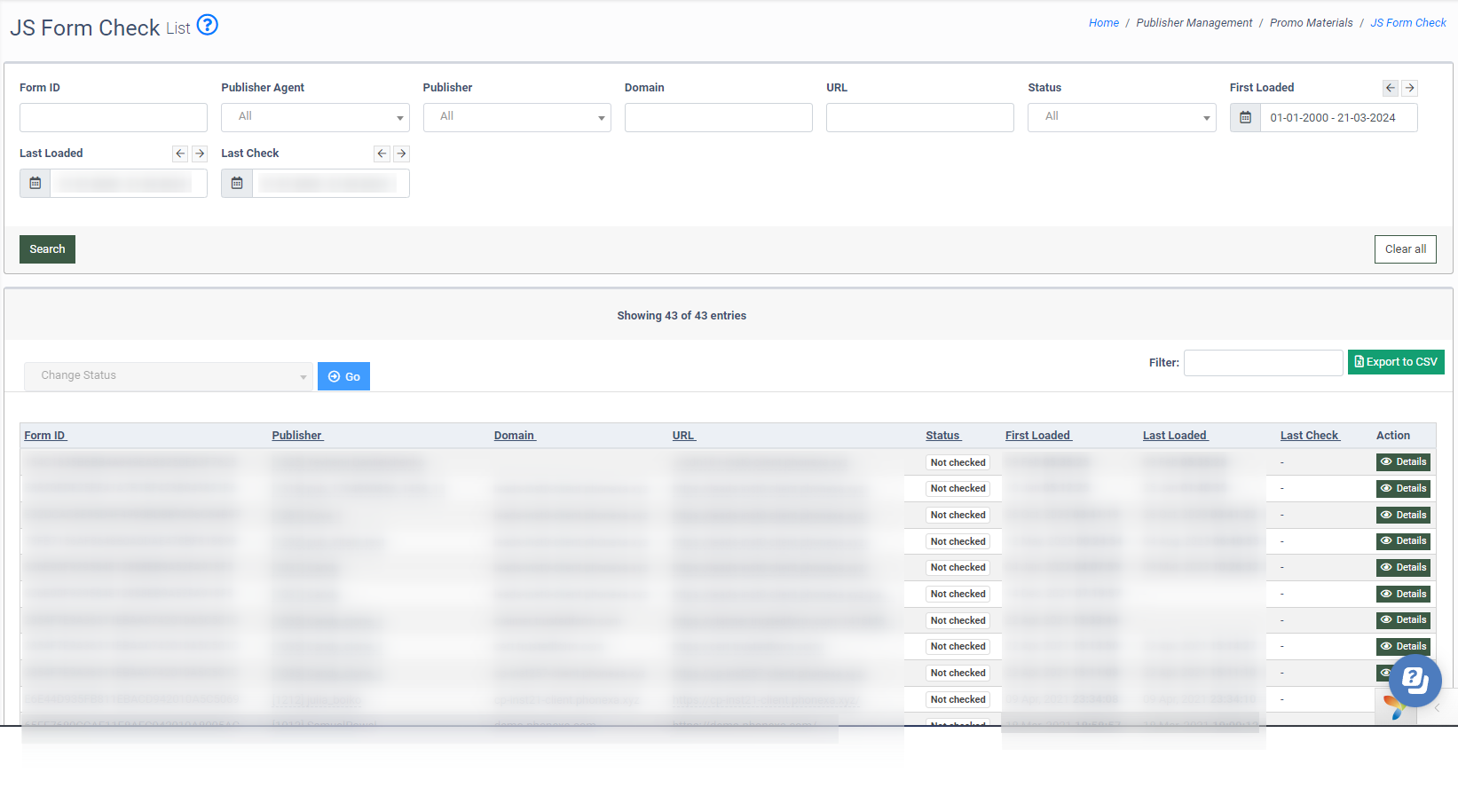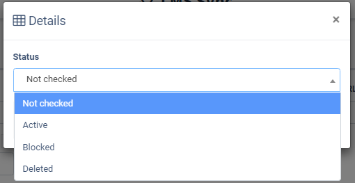 To change the JS Form’s status, click the “Details” button in the “Actions” column. In the “Details” pop-up window, select the status (Not checked, Active, Blocked, Deleted) and click the “Save” button to complete.