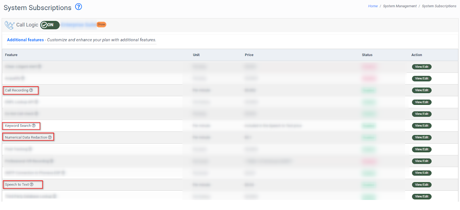 The Keyword analytics feature requires some additional features to be enabled. Go to the System Management > System Subscriptions section, select the Call Logic additional features, and activate the following by clicking the “View/Edit” button in the “Action” column: