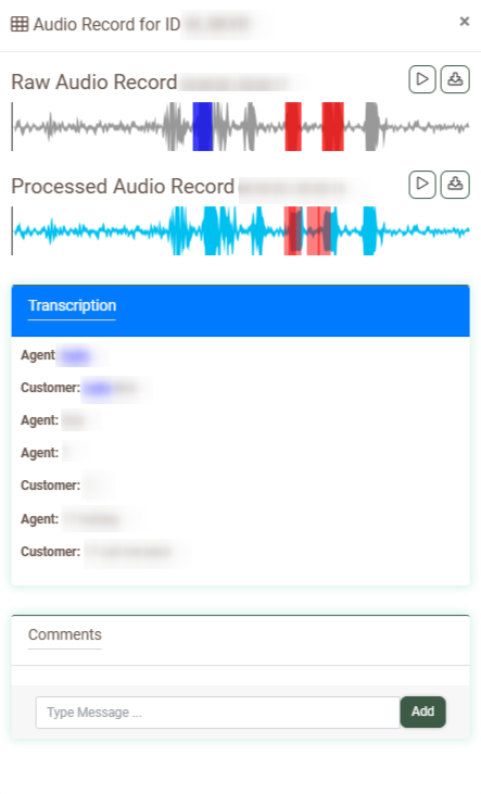 To listen to the call recording and to view the speech-to-text transcription, click the “Play” button in the “Play” column. The system recognizes and records two audio tracks from the Agent (the Buyer) and the Customer (the caller), respectively, and displays the word transcription below the tracks in the “Transcription” block. The keywords or key phrases are linked to the moment in the recording so that you can listen to them when you click on the keyword.