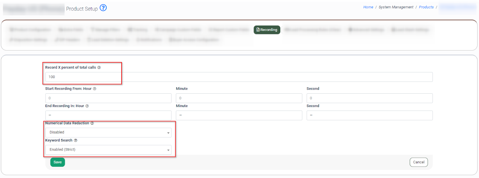 Go to the System Management > Products section and click the “Settings” button next to the Product. Go to the “Recordings” tab and configure the following fields: