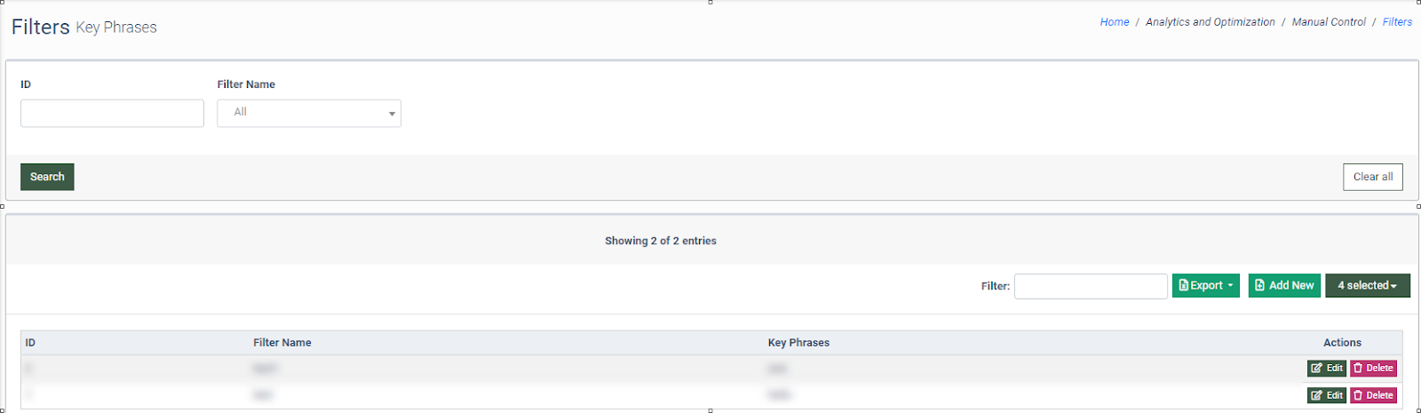 To track and analyze the keywords, you should first add them to the Key Phrase filters. Then, go to the Analytics and Optimization > Manual Control > Filters section to create and manage existing keyword filters.