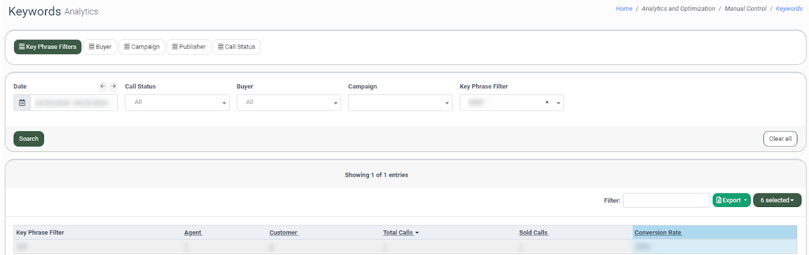Note: All values in the report (except the “Conversion Rate” and “Key Phrase Filter” values) are clickable. After clicking on a specific value, the system will redirect you to the “Keyword Search” section with these filters applied.