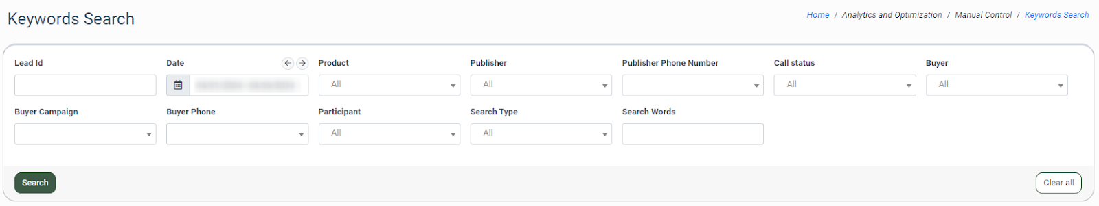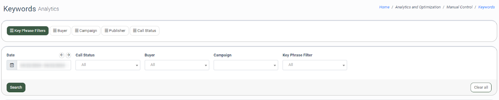 To view the sales details, filtered by Key Phrase Filter, go to the Analytics and Optimization > Manual Control > Keyword Search section.