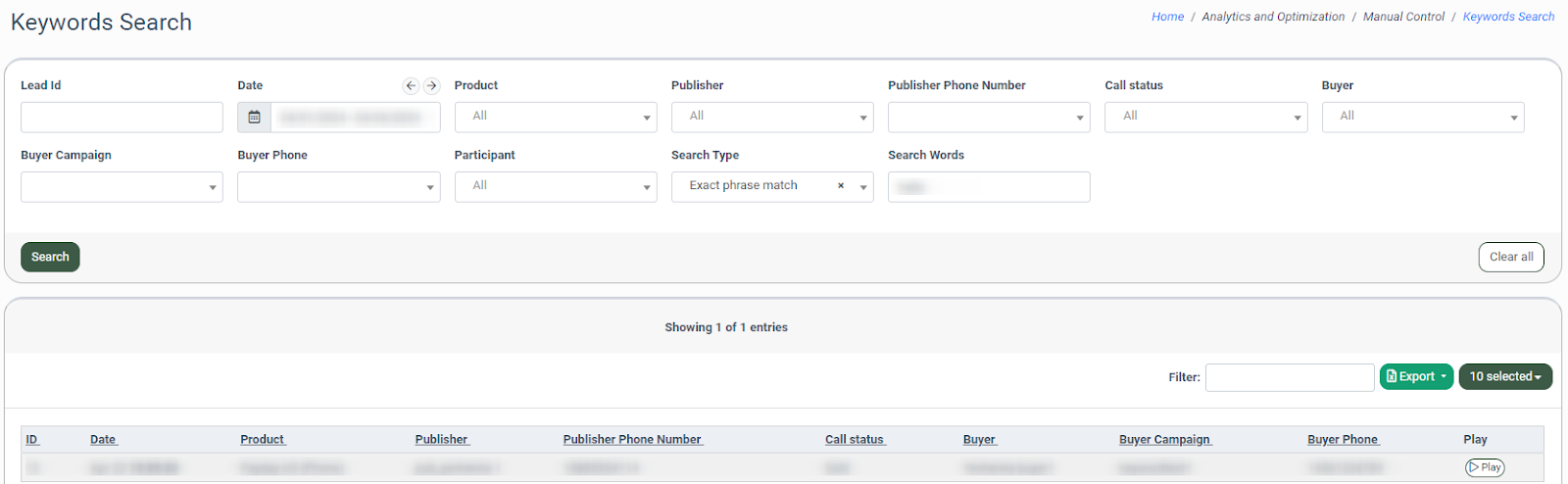 Note: You can view the text from the Buyer in the audio transcription. To see the transcription, go to the Lead Info page and select the “Call Record” tab or to the Analytics and Optimization > Manual Control > Keywords Search section and click the “Play” button in the “Play” column. To access the audio record, you have to enable Two-Factor Authentication. Read about the Lead Info page in this Knowledge Base article.
