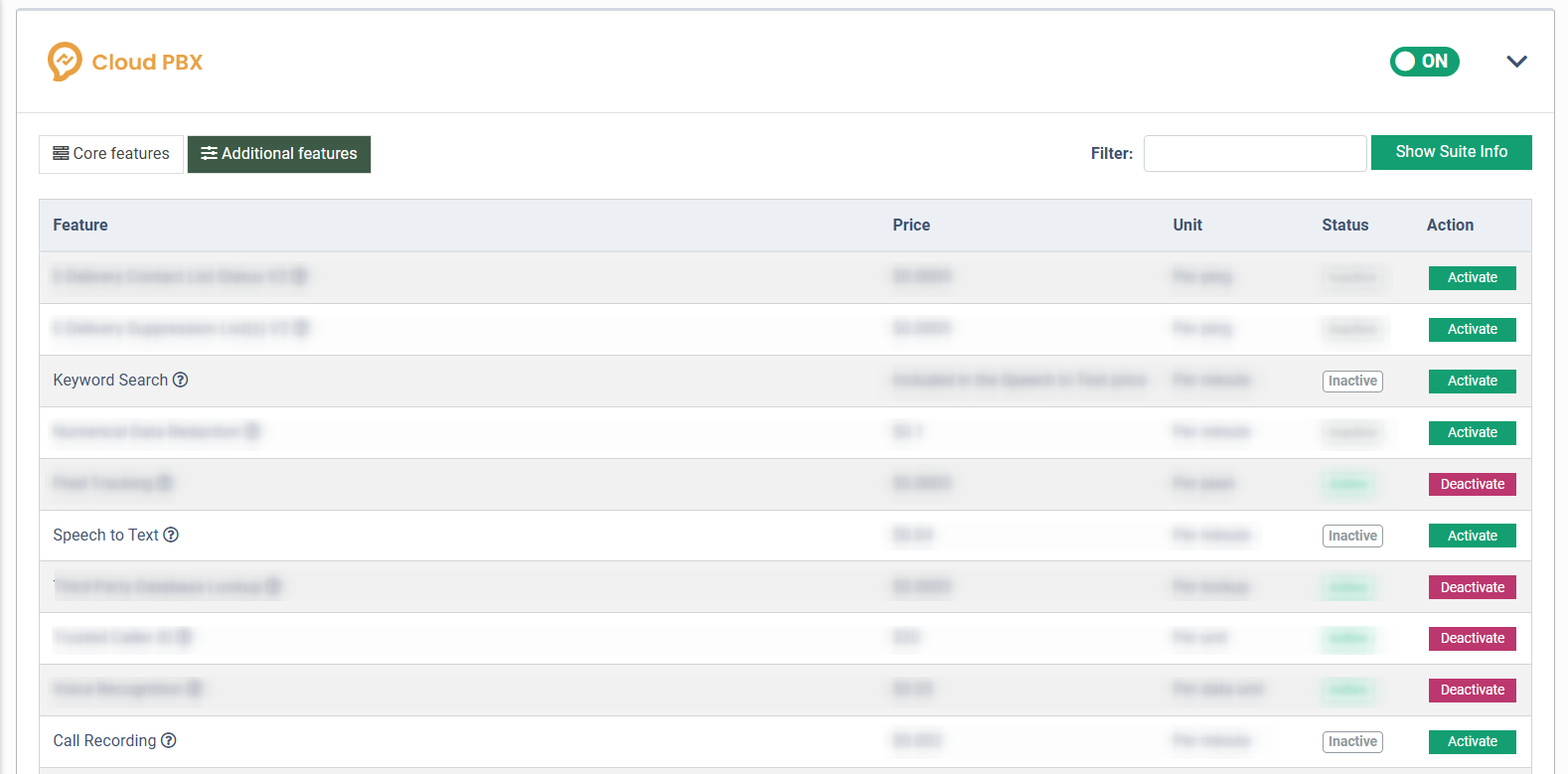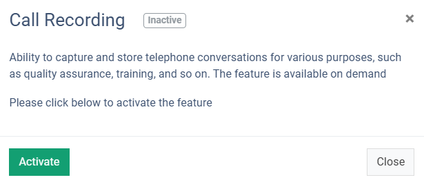 To enable the Call Recording feature, click the “Activate” button in the “Action” column and confirm the operation by clicking the “Activate” button in the following pop-up window.