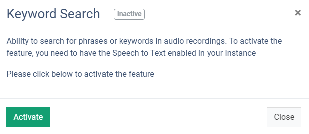 To turn on the Keyword Search option, the Speech to Text and the Call Recording features should be enabled.