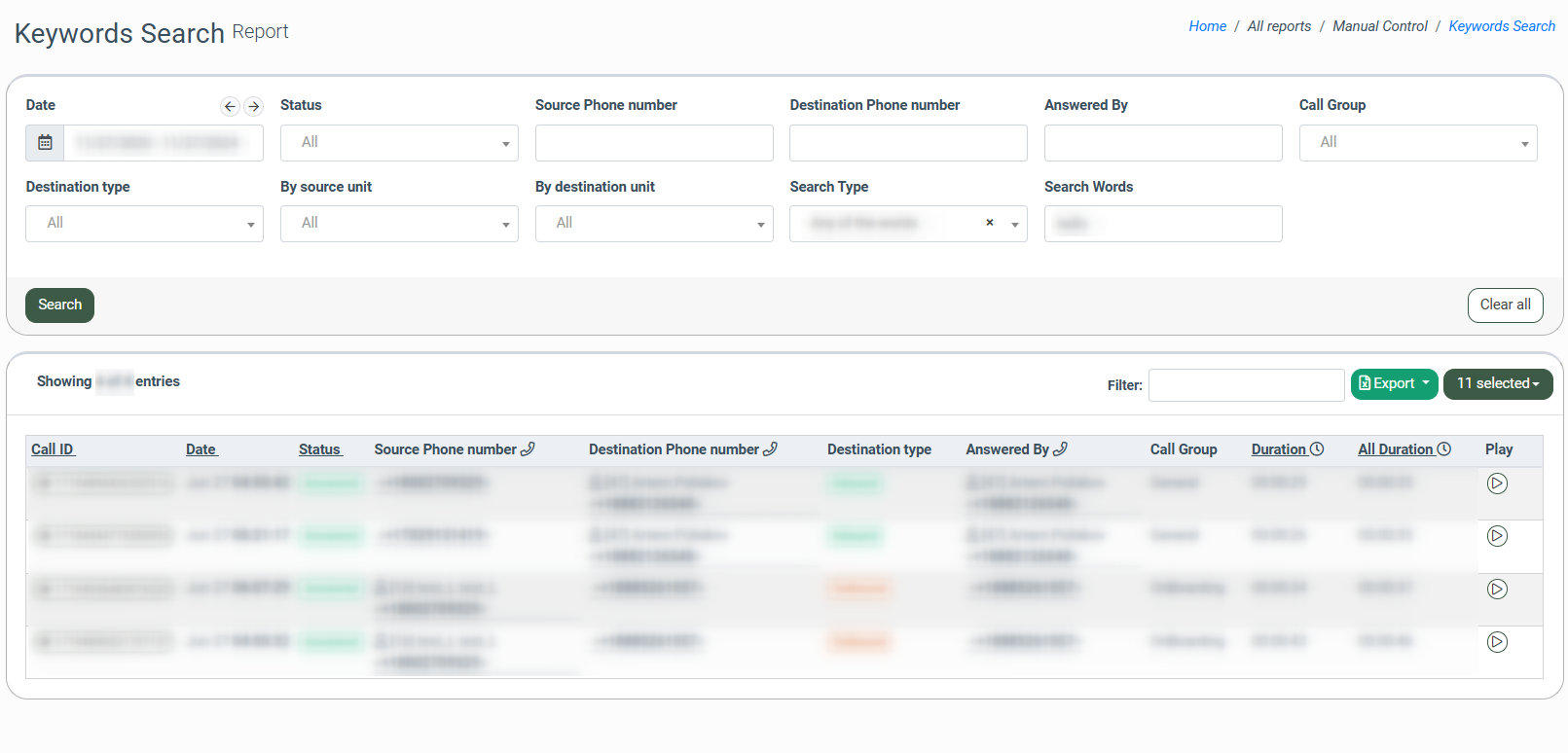 - Search Words: Enter the word that should be used as a keyword for the search through the call recordings.