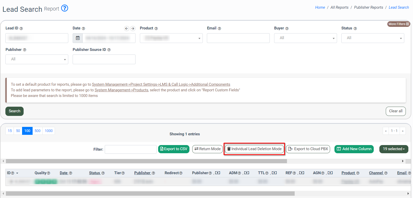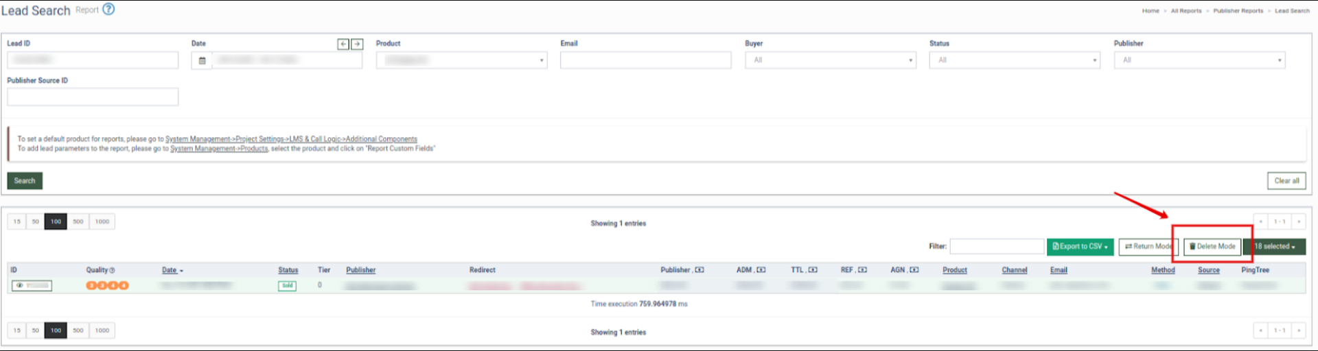 To view the Lead Delete page, go to the All Reports > Publisher Reports > Lead Search (LMS) / Call Search (Call Logic) section and click the “Delete Mode” button to switch to lead deletion mode.