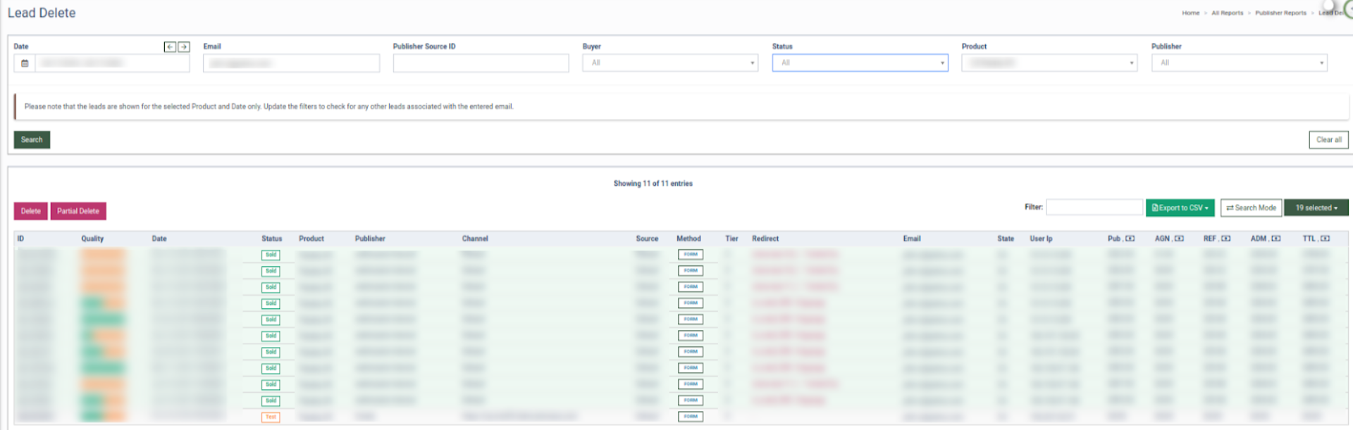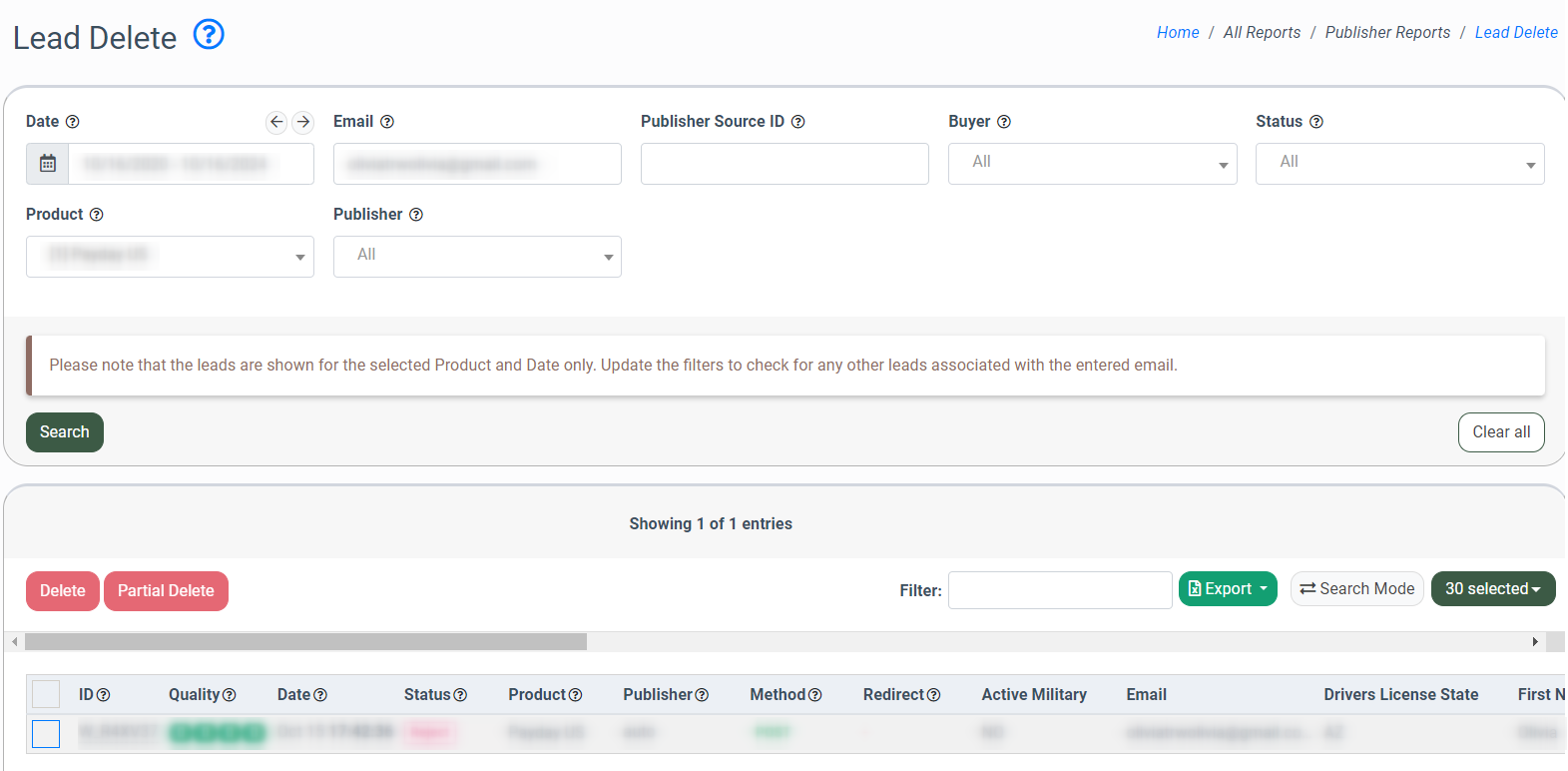 Note: Leads are shown and deleted for the selected Product and Date only. Update the filters to check for any other leads associated with the entered email.