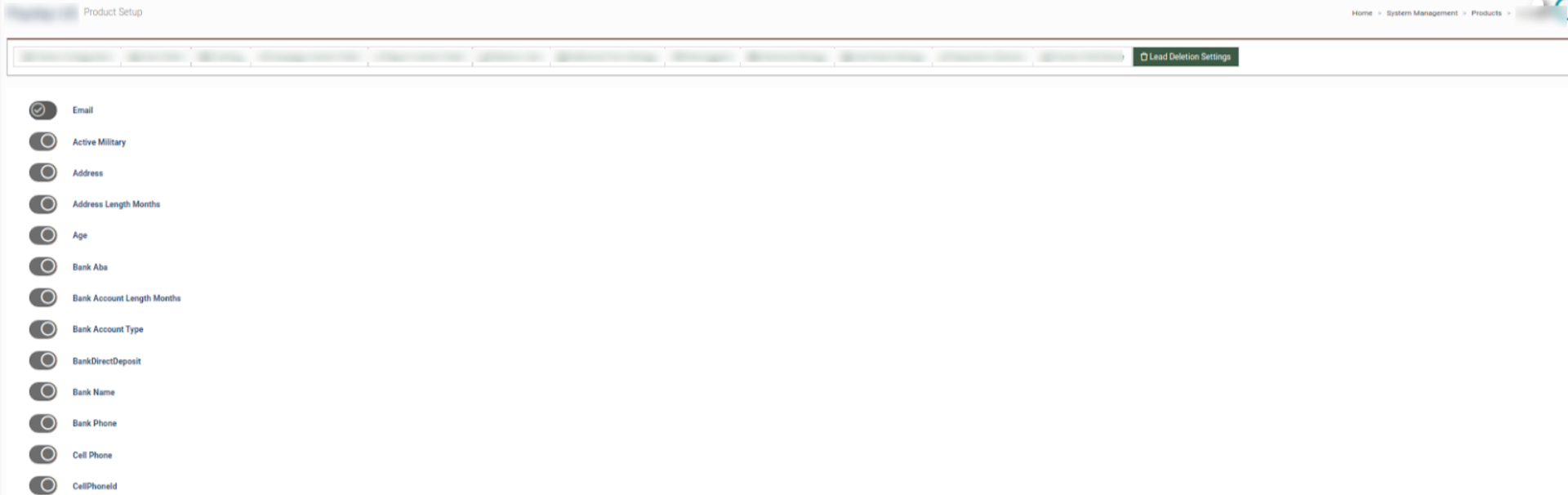 The Partial Deletion feature allows you partially delete lead data from the system. To select fields that will not be deleted by the Partial Delete option, go to the System Management > Products section, select the Product and go to the “Lead Deletion Settings” tab. Turn the toggle on to select fields that should not be deleted and click the “Save” button to complete the action. By default, Email (For LMS) and Phone Number (Call Logic) fields are enabled, as these fields are unique system identifiers.