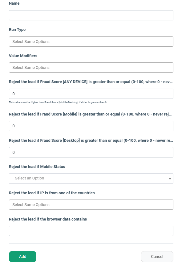 Select Third Party Service: Select the third-party service (Ip Scoring). Note: The IP Scoring third-party service allows you to perform real-time validation of the lead IP address and receive a fraud score based on 25 risk analysis data points. The service scores user data based on an IP address, device, email address, and phone number.