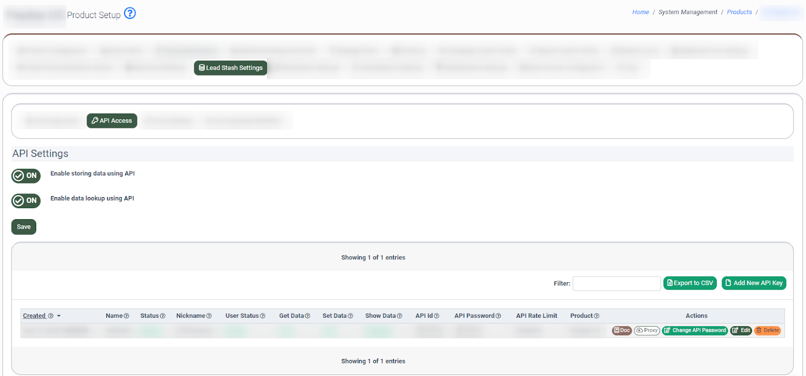 The “API Access” sub-tab allows you to manage access to the Lead Stash through the API.