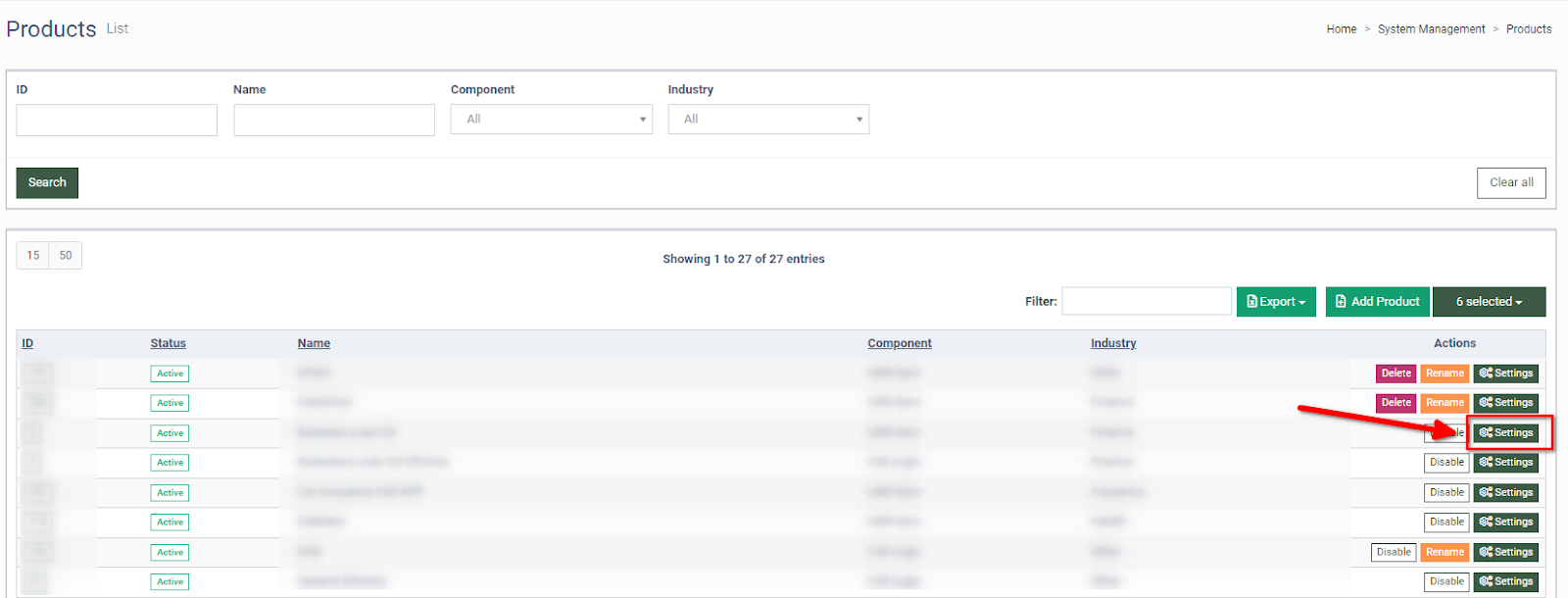 To configure Lead Stash settings, go to the System Management > Products section, choose the product, and click the “Settings” button in the “Action” column.