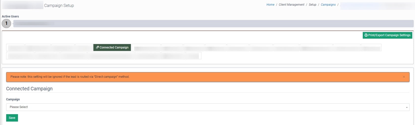 To connect Campaigns, go to the Client Management > Campaigns section, click the “Configure” button for the particular Campaign, and navigate to the “Connected Campaign” tab. Select the Campaign to connect in the “Campaign” field and click the “Save” button to proceed.