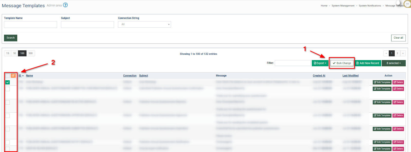 Click the “Bulk change” button (1) and check the boxes (2) of the Templates connections you want to change. Click the “Change” (orange square) button to change the connections of all the selected Templates.