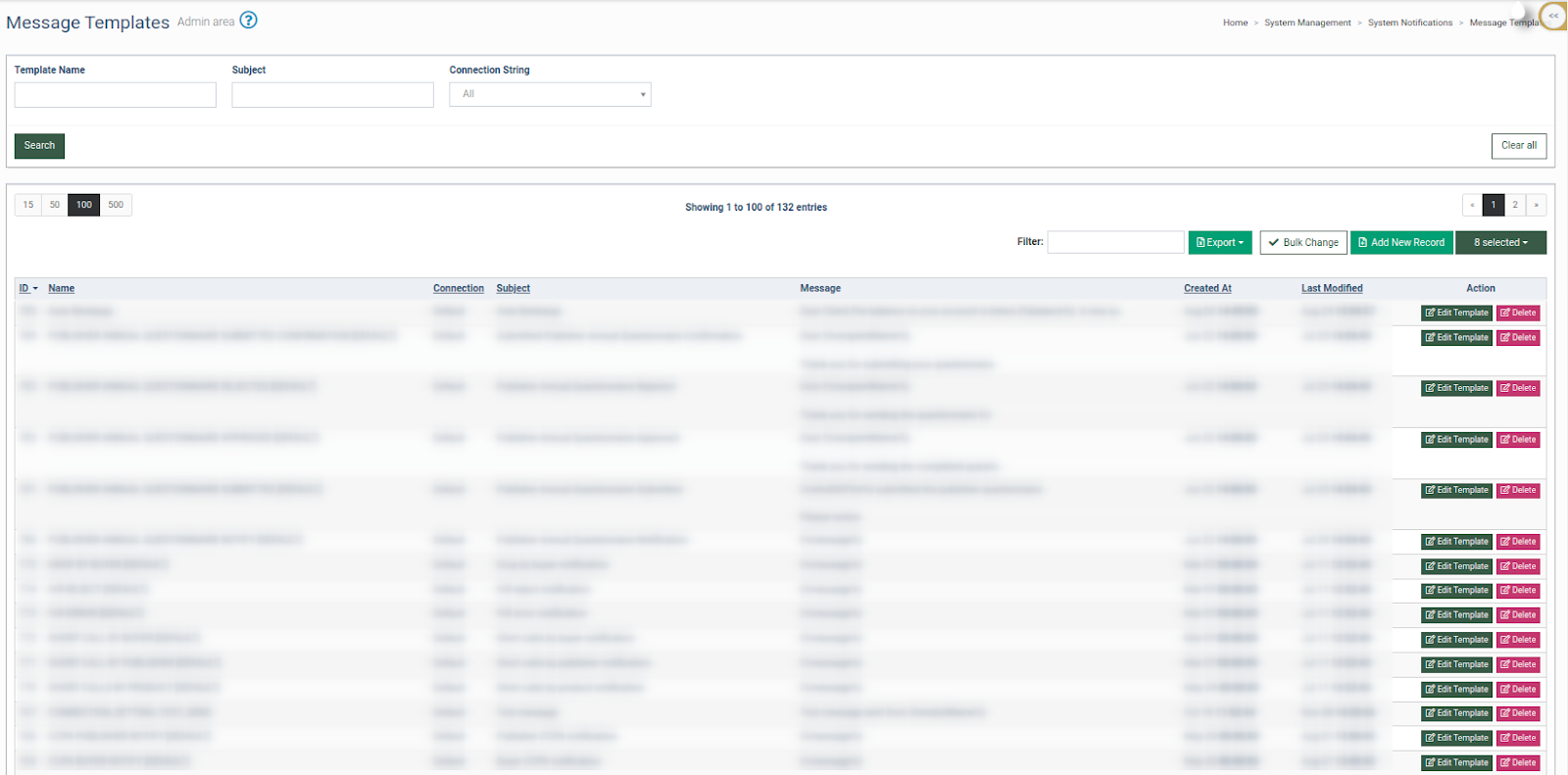 To edit a message template, click the “Edit” button opposite the required record in the “Action” column. Make changes in the “Edit Template” pop-up window and click the “Save” button to complete.