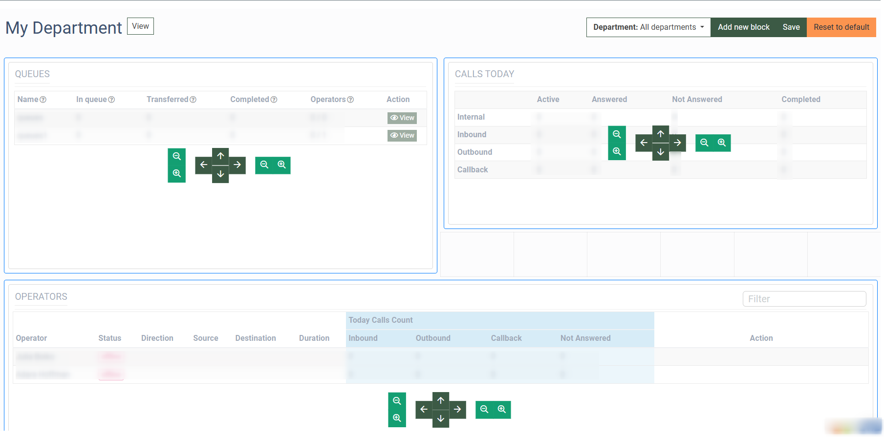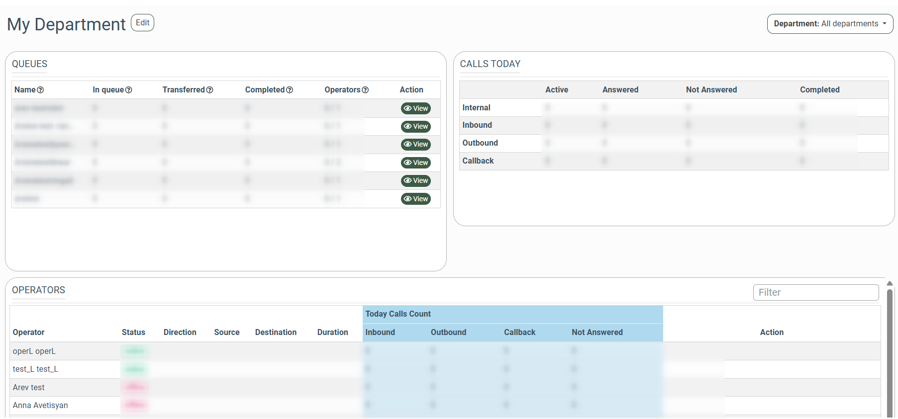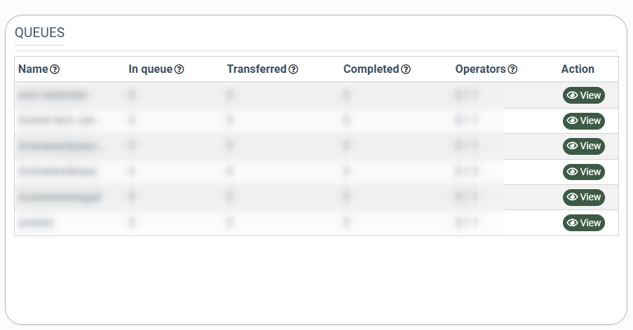 - Operators: The number of operators attached to the particular queue (total number of operators/the number of operators that are currently online). Note that there will be no operator and queue if they are not assigned to the corresponding department.