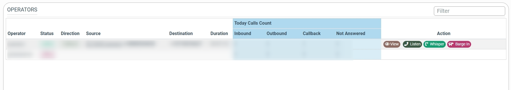 - Listen: To join an active call with a notification to the operator and caller about your presence, click the “Listen” button. The following workflow will be applied: the Department Manager clicks the "Listen" button during the active call of the Operator. Then, the Department Manager receives the call alert (his SIP client is ringing on the Manager's side), he accepts this call, and then he will be connected to the ongoing call of the Operator. The operator and the client will hear the ringing sound of the call that is sent to the Manager. This is considered as a notification about the Manager’s presence in the call.
