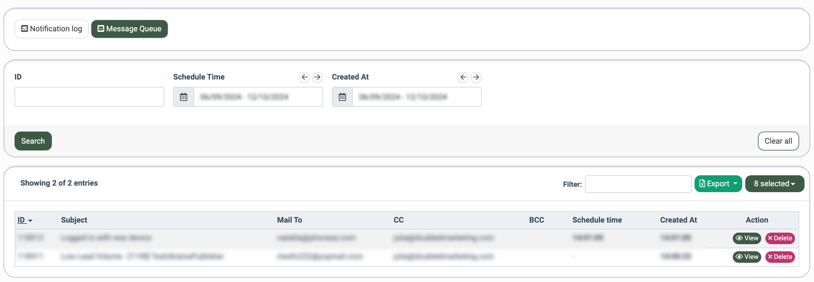 To delete the notification message from the queue, click the “Delete” button in the “Action” column.