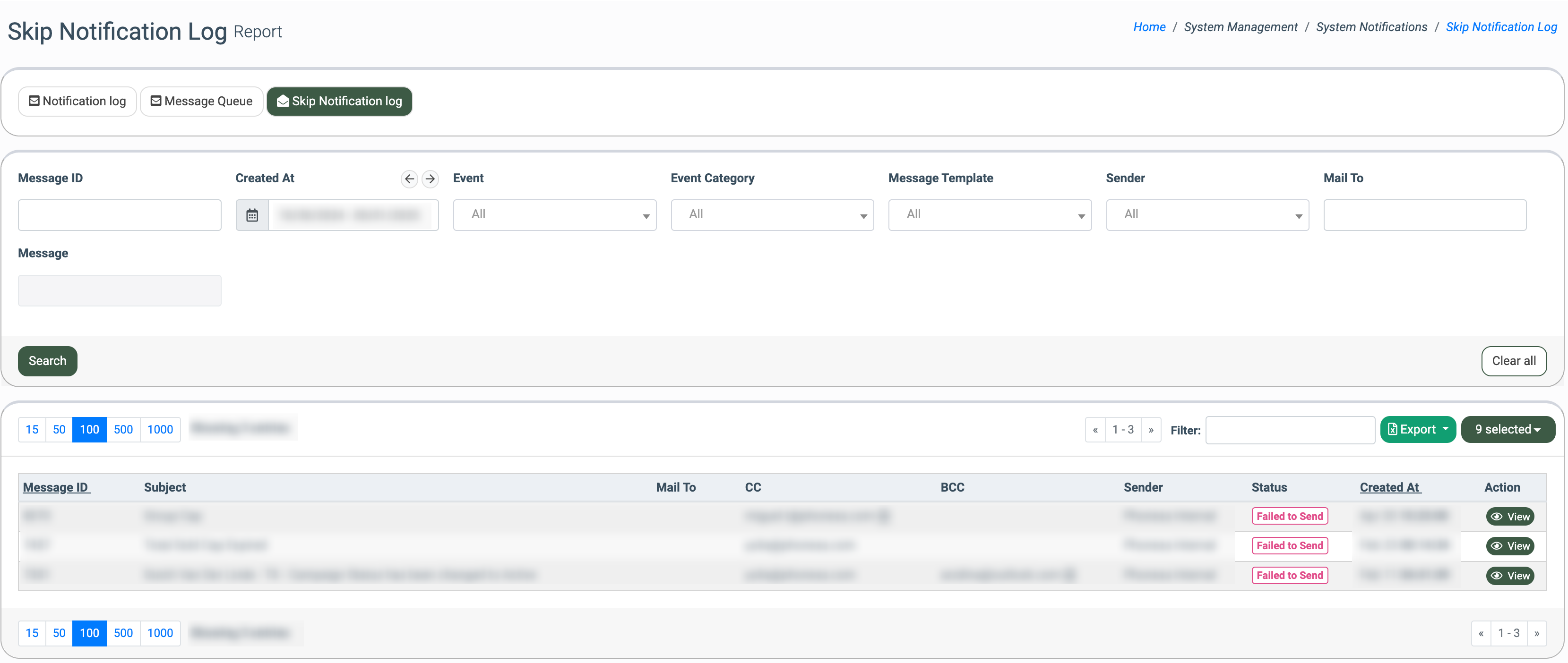 The Skip Notification Log tab shows all unsent emails caused by recipient errors, such as missing recipients, invalid email addresses, incorrect data, etc.