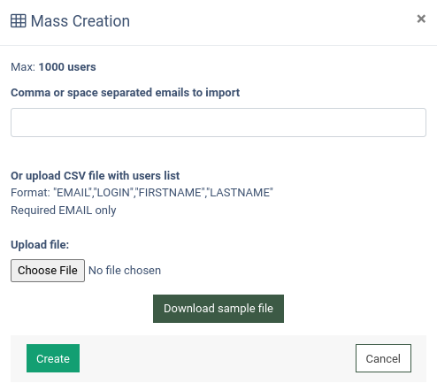 Note: The data in the file should be in the exact format - "EMAIL", "LOGIN", "FIRSTNAME", "LASTNAME". The "EMAIL" field is required.