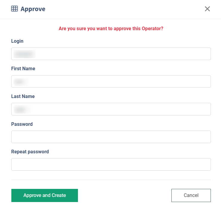 To complete the process of the unconfirmed operator approval, click the “Approve” button in the “Actions” column. Review the information about a new operator you would like to create and complete the approval operation by clicking the “Approve and Create” button in the “Approve” pop-up window.