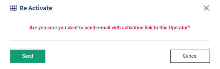 To send the account activation link to the unconfirmed operator, click the “Re Activate” button in the “Actions” column. Confirm the email resending operation by clicking the “Send” button in the “Re Activate” pop-up window.