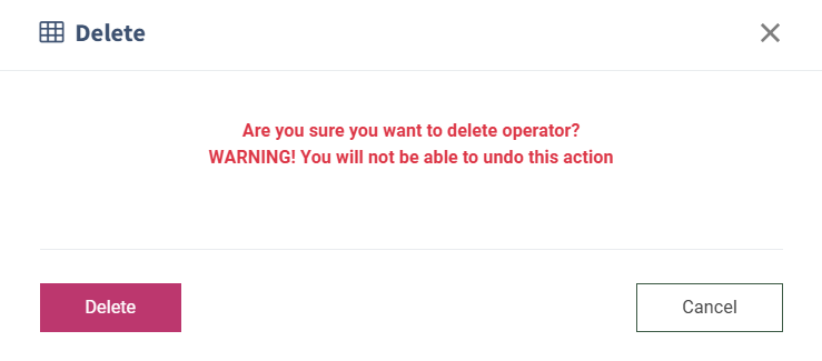 To remove the unconfirmed operator from the list, click the “Delete” button in the “Action” column. For completing the action click the “Delete” button in the “Delete” pop-up window.