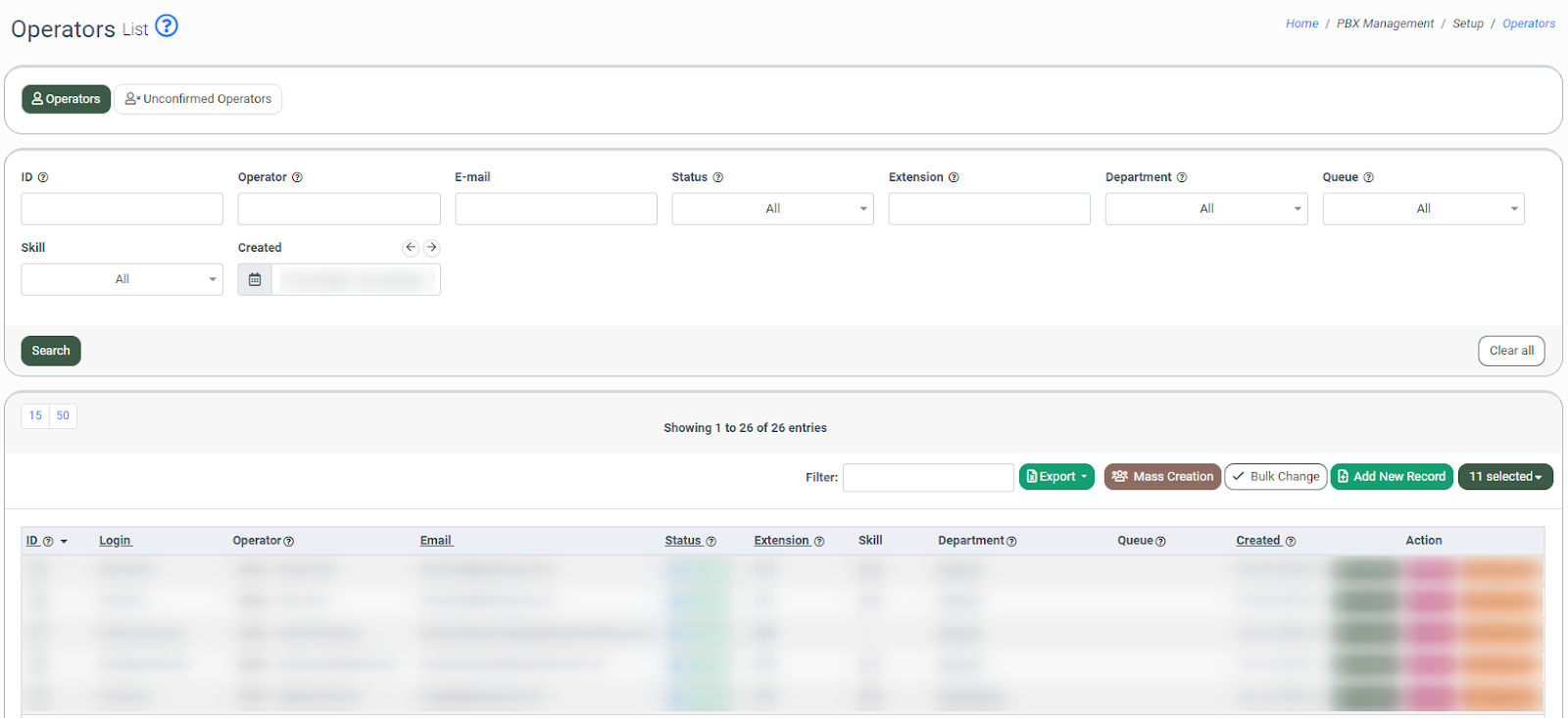 To view the Operators list, go to the PBX Management > Setup > Operators section.