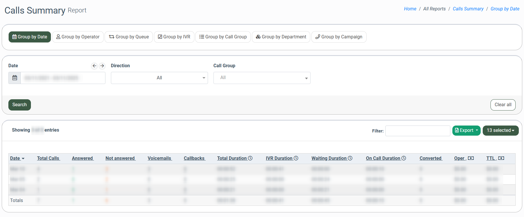 You can view the report grouped by Date, Operator, Queue, IVR, Call Group, Department, and Campaign. The grouped data will be displayed in the corresponding tabs respectively.