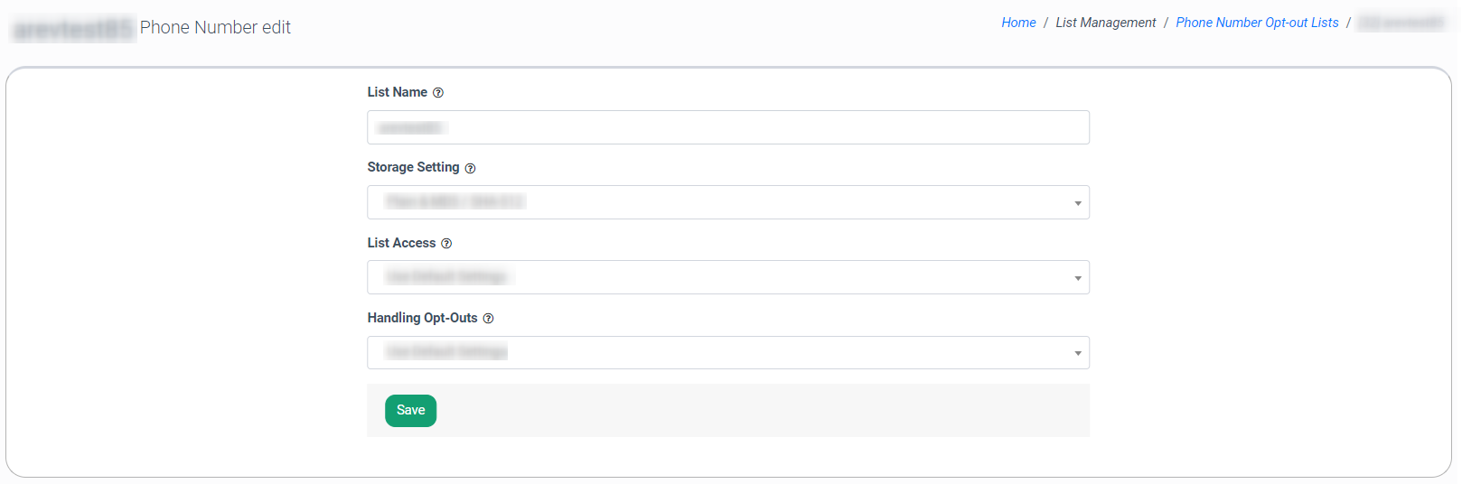The “Phone Number Opt-out Lists” section allows you to add, edit, and delete the lists of the phone numbers, change the status of the list, and save the lists of the reports.