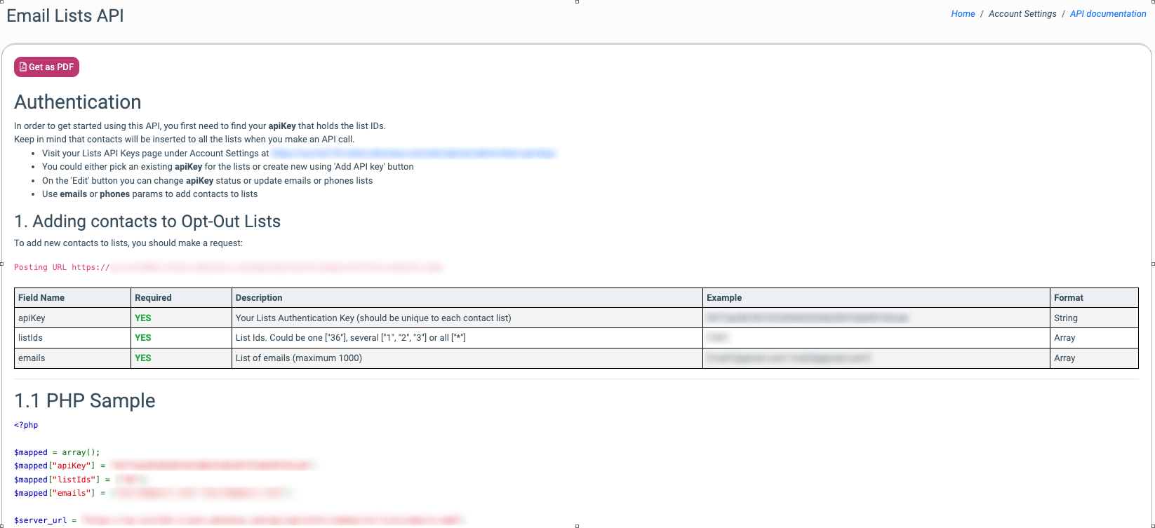 To view the API documentation for each list, go to the List Management > Phone Number/Email Opt-out Lists section.