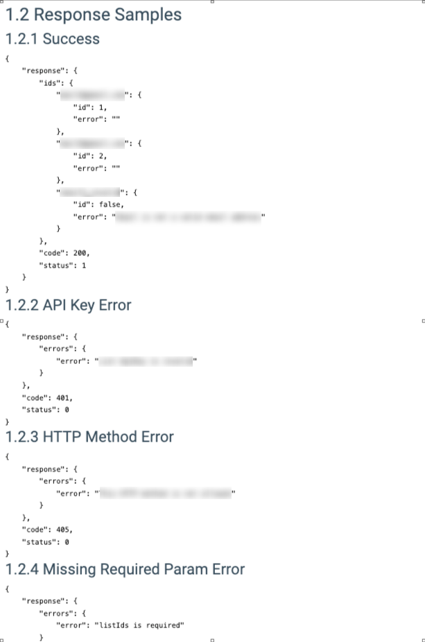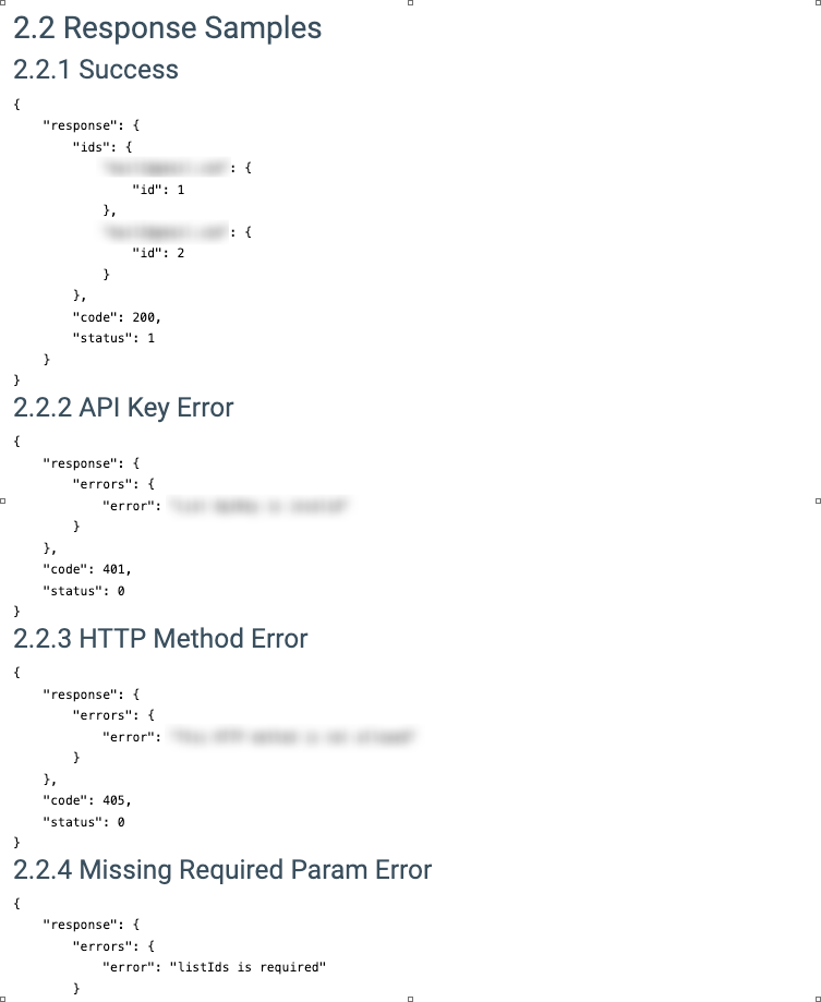 - API Key Error: Example of a response when the List API Key is invalid.