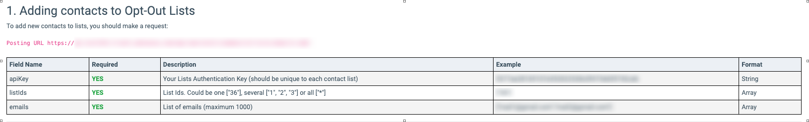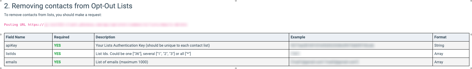 The Phone Number/Email Lists API allows you to manage the Opt-Out list(s) by providing documentation for adding or deleting contacts through the API.