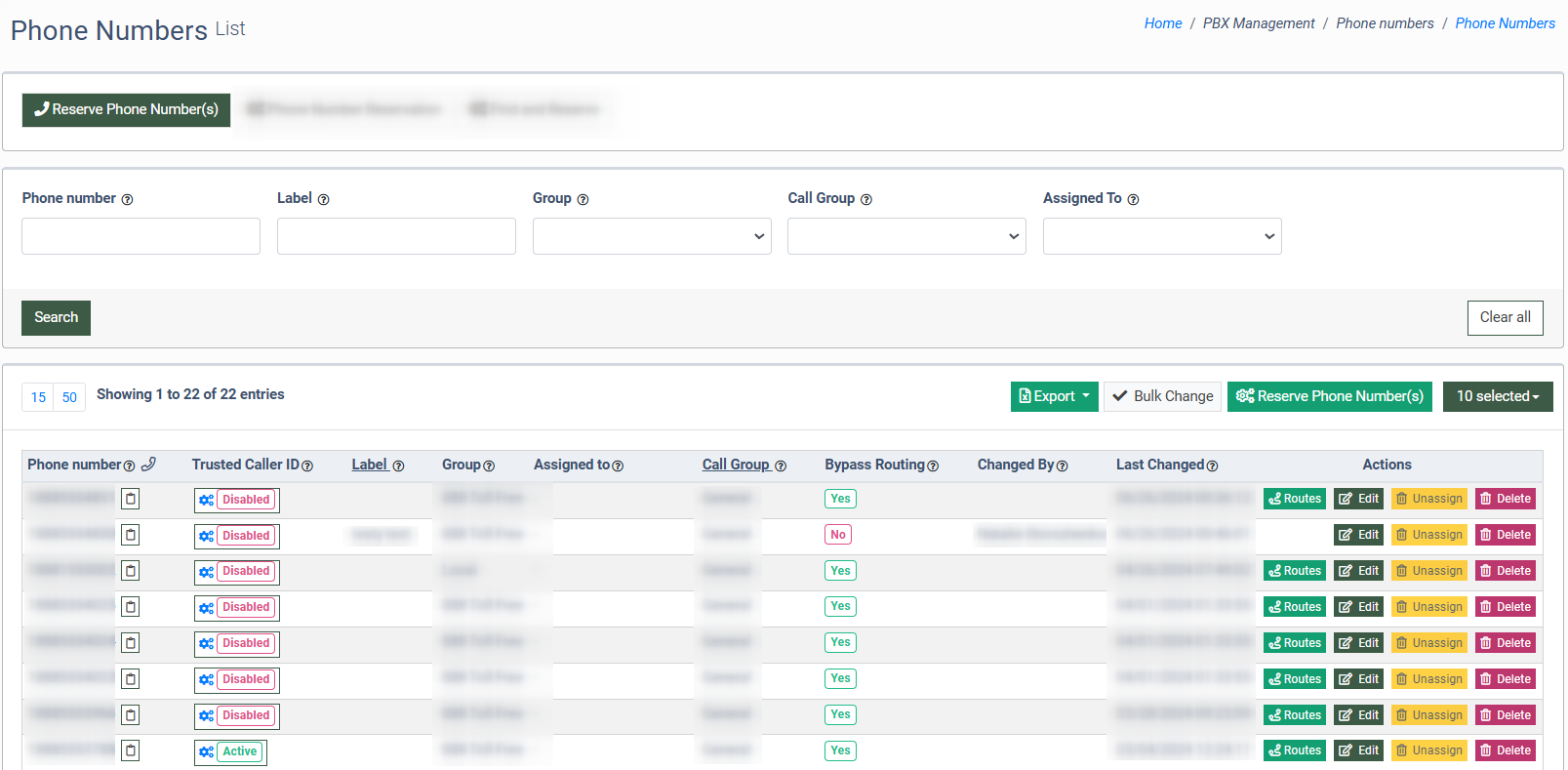 Click the “Bulk Change” button and select the required phone numbers to apply changes to multiple numbers at once.