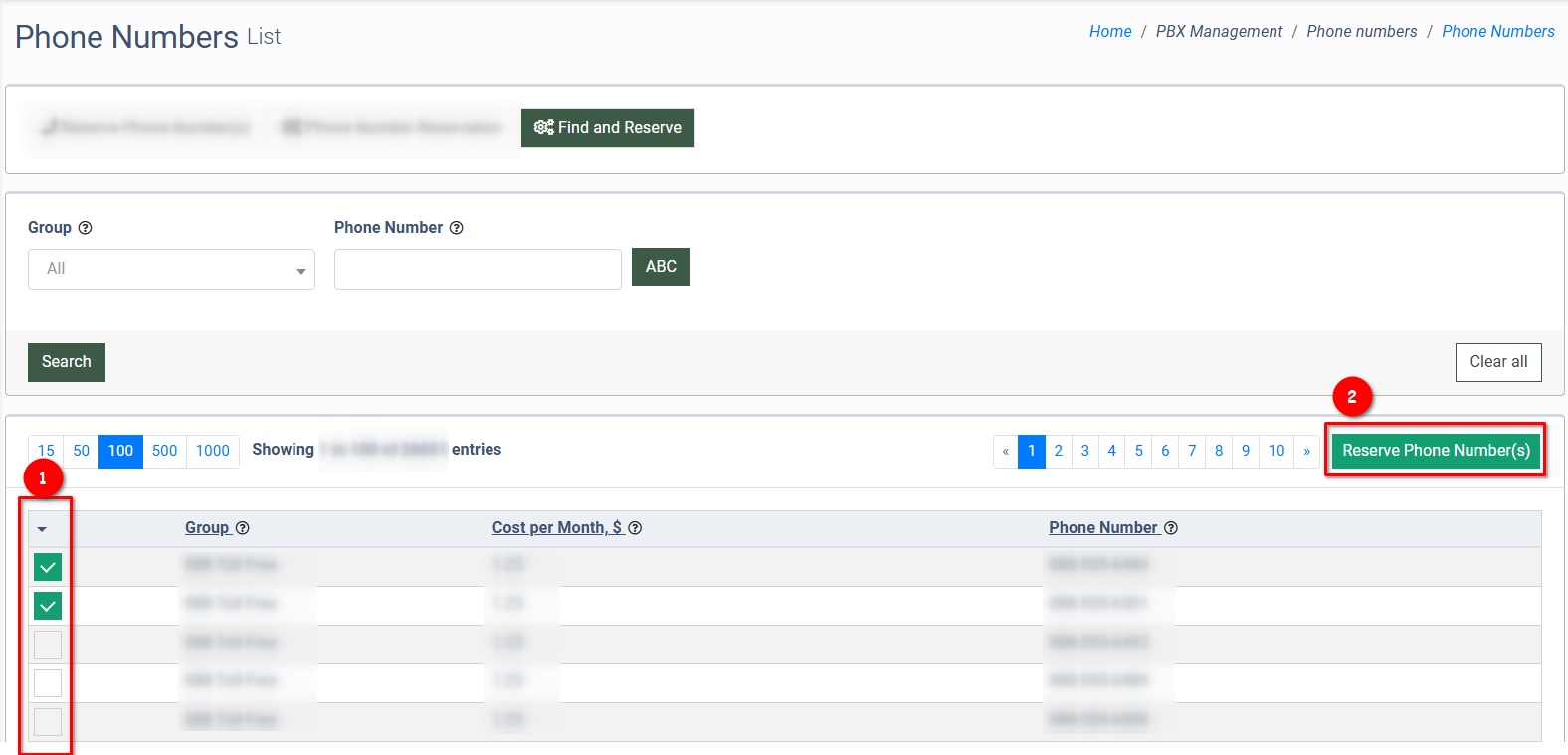 To view the list of phone number groups available for reservation, click the "Reserve Phone Number(s)" button. The system will redirect you to the "Phone Numbers Reservation” tab. Please view the description below.