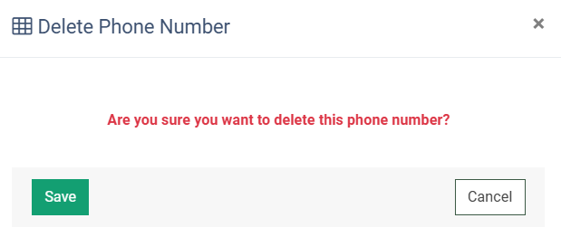 To delete the phone number from the list, click the “Delete” button in the “Actions” column. Confirm the action in the “Delete” pop-up window and click the “Save” button, or click the “Cancel” button to close the window.
