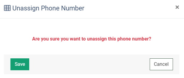 Click the “Unassign Phone Numbers'' button (3) to unassign the selected numbers. Click the “Save” button to confirm the action, or click the “Cancel” button to close the window.