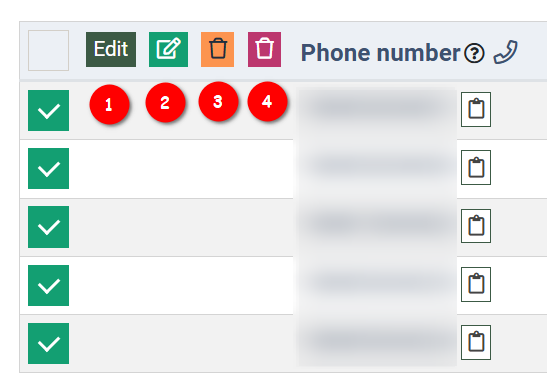 Click the “Delete Phone Numbers” button (4) to delete the selected numbers. Click the “Save” button to confirm the action, or click the “Cancel” button to close the window.