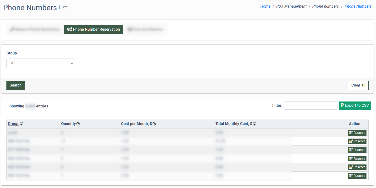 The “Phone Numbers Reservation” tab displays the list of phone number groups available for reservation and their cost.