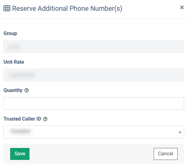 In the “Reserve Phone Number(s)” pop-up window, select the status of the “Trusted Caller ID” feature. Click the “Save” button to confirm the action, or click the “Cancel” button to close the window.