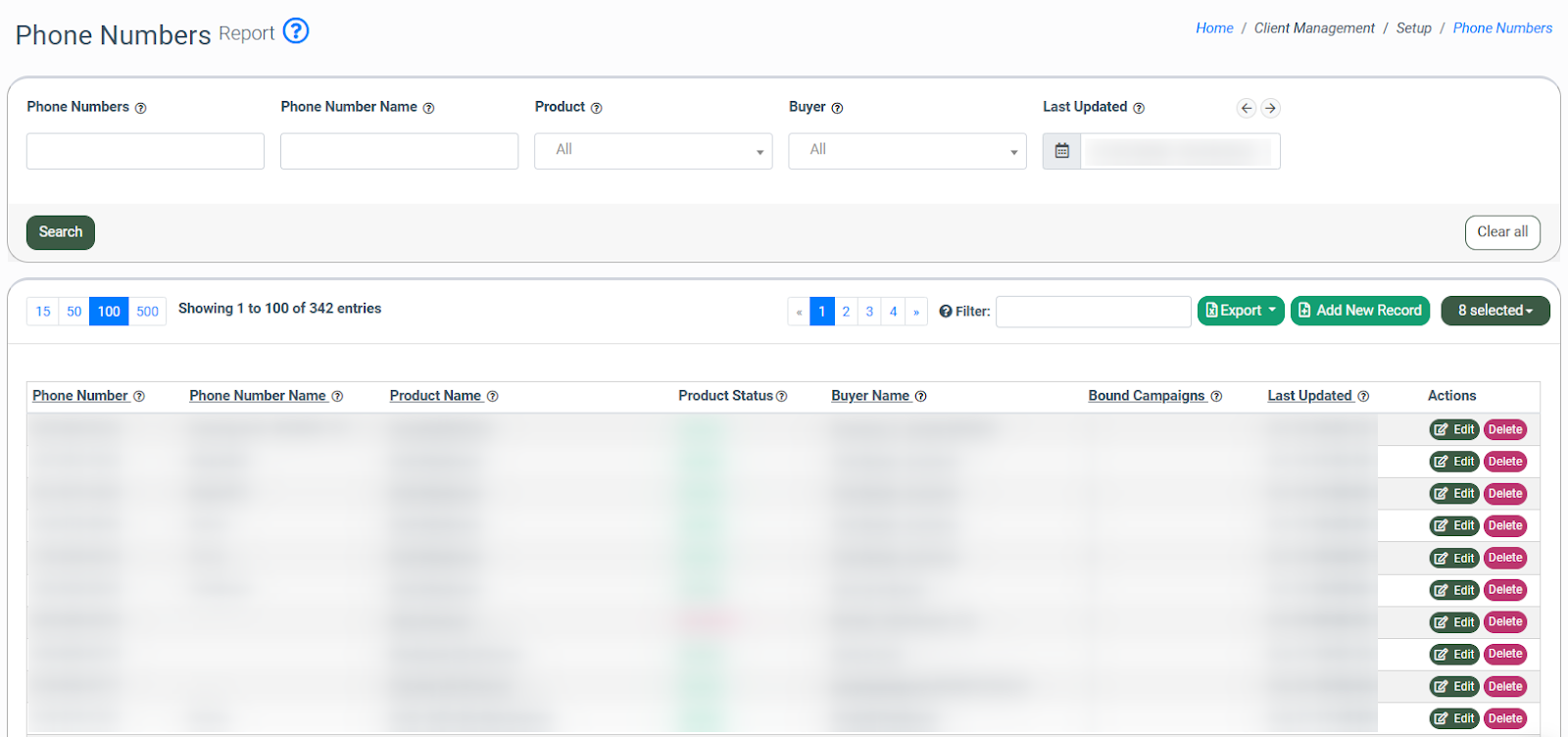 The Phone Numbers report contains the phone numbers of all Buyers. The table contains basic information for the numbers: ID, the Buyer who is assigned to the phone number, the Product to which the number is linked, Product status, etc.