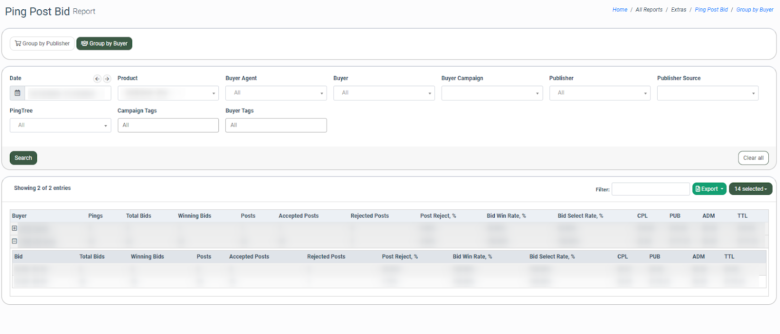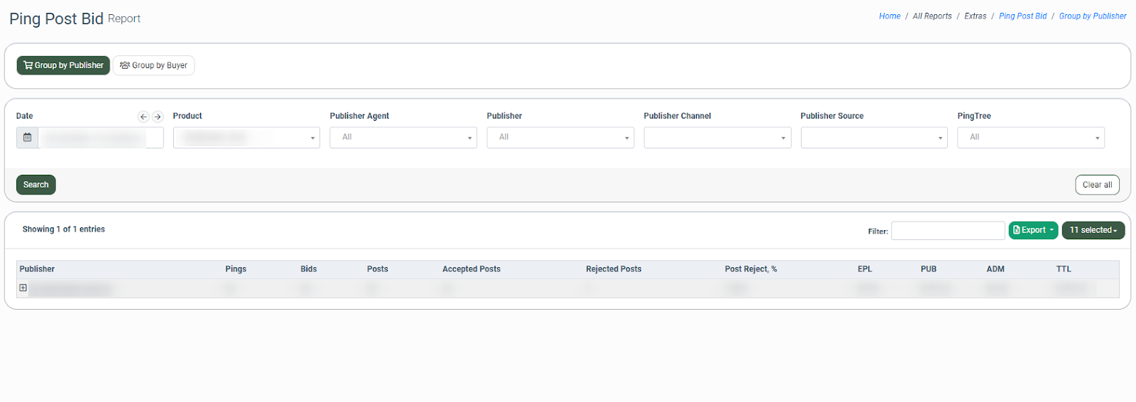 The Ping Post Bid report allows you to view Publisher performance and bid range effectiveness, as well as bid data from Buyers for Products using the ping post model.