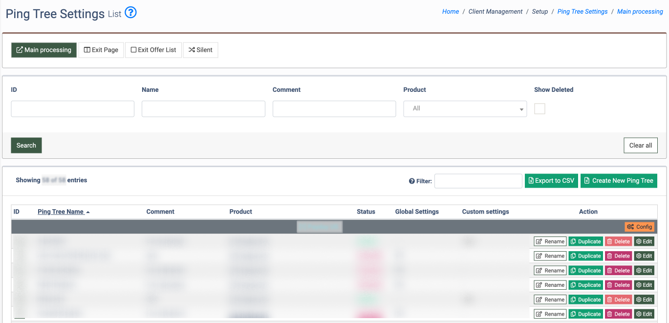 • Main processing: The tab displays a list of all ping trees for the Main processing Campaign type grouped by the Product (for LMS only).