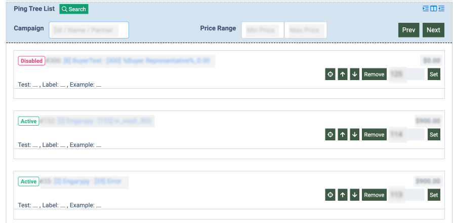 The “Ping Tree List” block displays all of the campaigns added to the Ping Tree and allows you to change the list order according to your preference. You may use tools on the right side of the list block to move, select, and remove campaigns from the list.