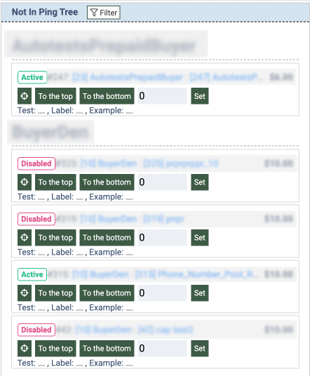 The “Not In Ping Tree” list displays all the campaigns that have not been added to the Ping Tree, sorted by the buyer. You can use the tools on the right side of the block to select campaigns, move campaigns to the Ping Tree, and set campaign values. You may also use the drag-and-drop method to move the campaigns from one list to another.