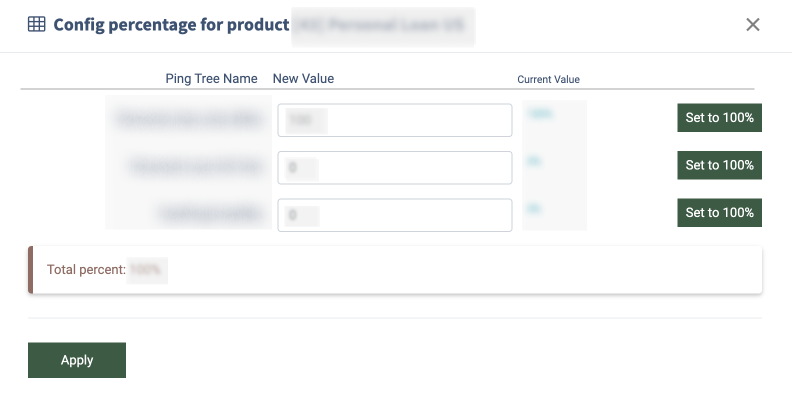 • Global Settings: Traffic distribution among all ping trees for a Product in percentage (%).