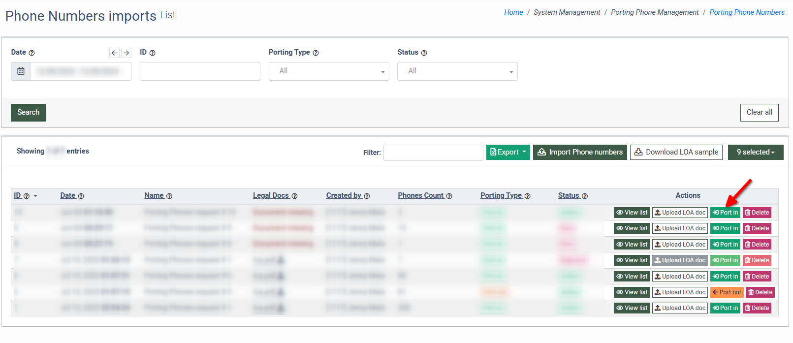To port in (port out) the Phone Number list, go to the System Management > Porting Phone Management > Porting Phone Numbers section and find the required list by using the filters.