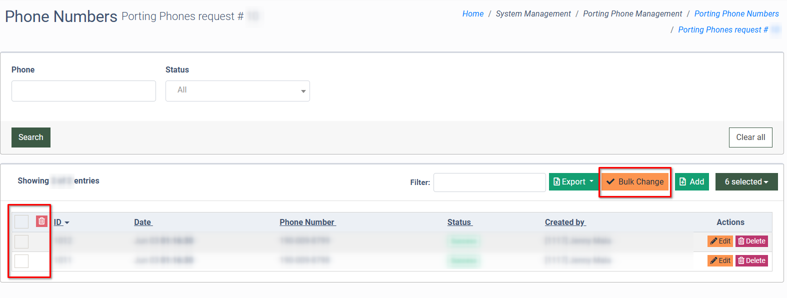 To delete several phone numbers from the list, click the “Bulk Change” button, select the corresponding checkboxes, and click the “Delete” button in the first column of the report to complete the action.